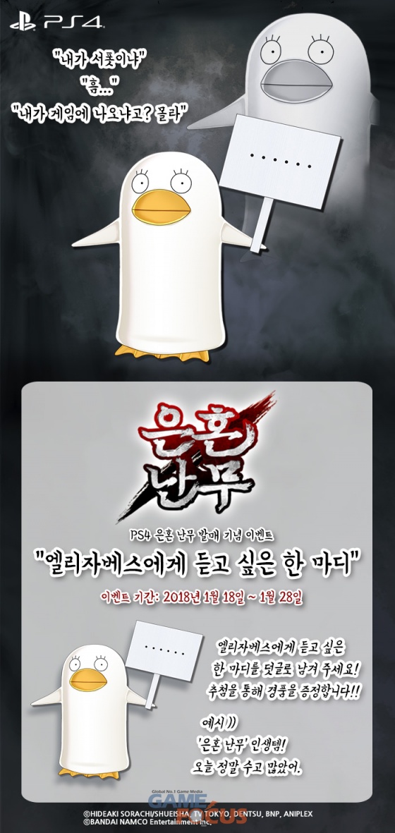 한편 '은혼 난무'의 한국어판 발매를 기념하여 반다이남코 엔터테인먼트 코리아 공식 블로그에서는, 오는 1월 28일까지 엘리자베스에게 듣고 싶은 한 마디를 덧글로 남기는 유저에게 추첨을 통해 호화 경품을 증정한다.