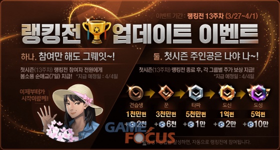 한편, NHN엔터테인먼트는 4월 1일까지 랭킹전 오픈 기념 이벤트를 진행하고 매주 획득 가능한 랭킹전 보상 외에 추가 보상을 받을 수 있는 기회도 제공한다. 랭킹전에 참여만 해도 '봄소풍 순애교' 아이템을 100% 획득할 수 있으며, 랭킹전 등급에 따라 추가 보상을 지급하여 최대 5억 쩐과 코인 10만 개를 추가로 획득할 수 있다.