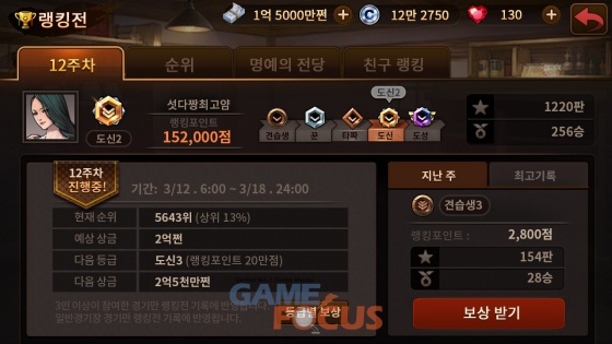랭킹전은 매주 월요일 오전 6시부터 일요일 자정까지 진행된 게임에 대한 점수를 누적하여 등급을 매기고 등급에 따른 보상을 지급하는 방식으로 진행되며, 이용자는 랭킹전 등급에 따라 매주 최대 300억 쩐에서 최소 5백만 쩐의 보상을 획득할 수 있다.