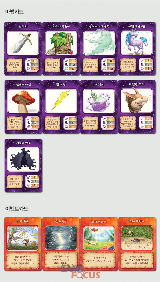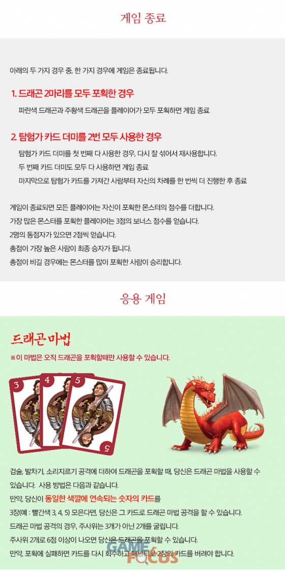 몬스터를 무찌르기 위해서는 세 가지 방법이 있다. 연속된 번호 순서대로 카드를 내는 '검술', 같은 숫자의 카드를 내는 '발차기', 같은 색깔의 카드를 내는 '소리지르기' 중에 어느 방법이 효과적일지 고민하는 전략적인 재미가 특징.