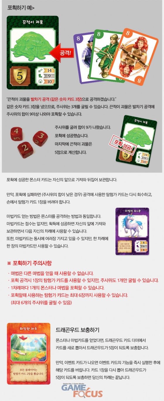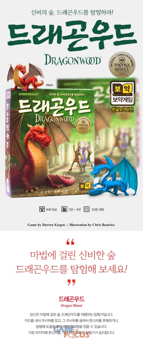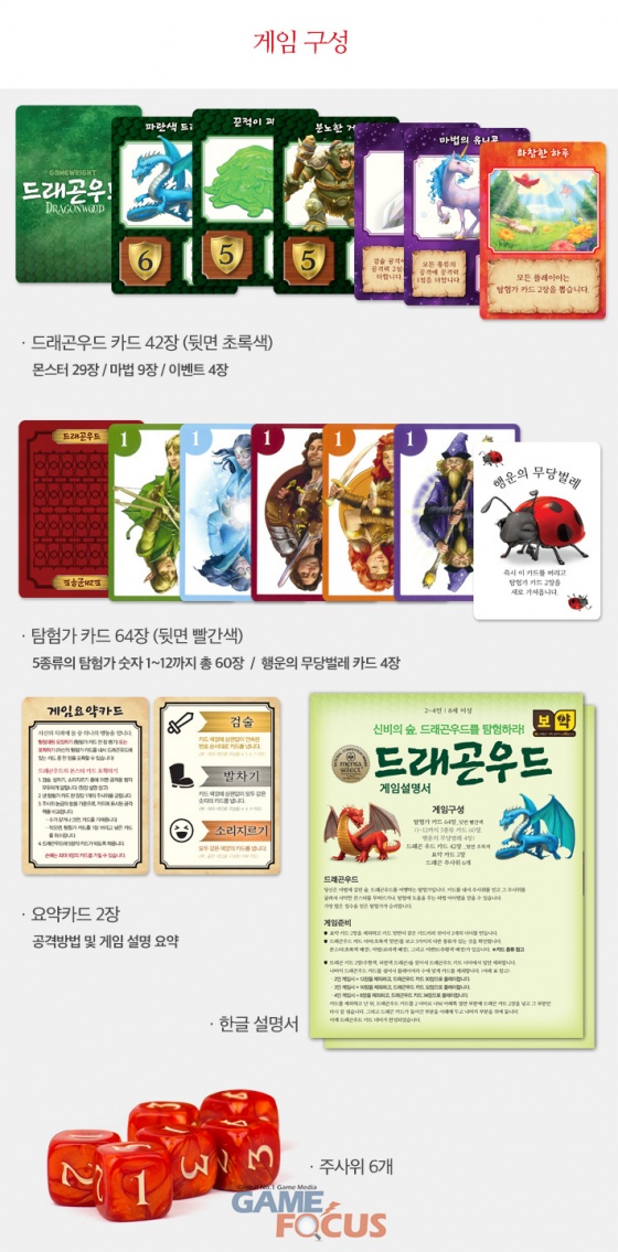 '드래곤우드'에서 플레이어는 탐험가가 되어 마법에 걸린 숲, 드래곤우드를 여행한다. 카드를 내서 주사위를 얻고 주사위를 굴려서 사악한 몬스터를 무찌르거나, 탐험에 필요한 마법 아이템을 얻을 수 있다.