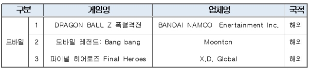한편 FingerFun Limited의 모바일게임 '더 킹 오브 파이터즈 UM온라인'는 종합순위 100위권에 재진입 하였으나 확률을 공개를 하지 않아 2회 누적 미준수 게임물로 이름을 올렸다.