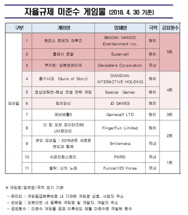 그 밖에도 모바일게임 PWRD의 '슈퍼진화스토리', Funcell123 Korea의 '렐릭: 신의 노래' 총 2종 게임물이 신규 미준수 게임물로 확인되어, 2018년 4월 말 기준 자율규제 미준수 게임물은 총 11종이다.