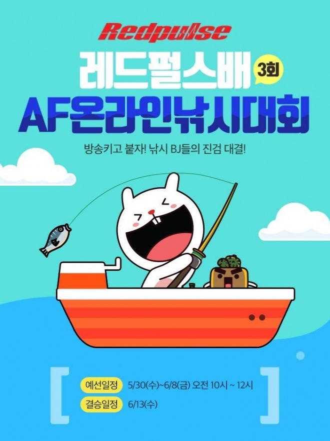 아프리카TV가 30일(수) 예선전을 시작으로 제 3회 '레드펄스배 AF 온라인 낚시대회'를 개최한다. 지난 해 1회와 2회에 이어 다섯 달 만에 제 3회를 맞이하는 'AF 온라인 낚시대회'는 낚시용품 전문 업체 '레드펄스'의 후원을 통해 바다 1개 부문으로 진행된다.