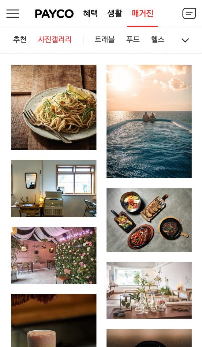'페이코 매거진'은 의식주에 기반한 라이프 컨텐츠를 큐레이팅해 제공하는 프리미엄 콘텐츠 서비스로, 분야별 전문 큐레이터가 엄선한 '추천' 코너와 고화질 사진 중심의 컨텐츠 '사진갤러리', 트래블, 푸드, 헬스 등 주제별 전문 코너로 구성됐다.