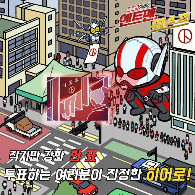 마블 코리아 공식 인스타그램 계정을 통해 순차적으로 공개된 이번 '앤트맨과 와스프'의 인스타툰에는 크고 작은 사이즈로 변한 앤트맨과 와스프가 유권자들에게 투표를 독려하는 모습이 재치 있게 담겨있다.