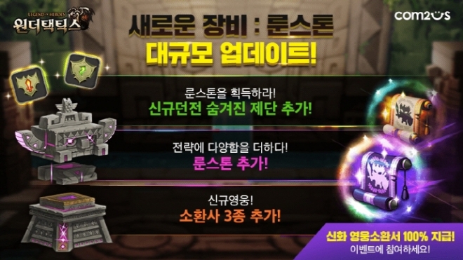 이번 업데이트에서는 신규 장비 ‘룬스톤’, 신규 던전 ‘숨겨진 제단’, 신규 영웅 소환사 3종 등 게임의 전략적 요소를 확대하고 재미를 더하기 위한 다양한 콘텐츠가 추가됐다.