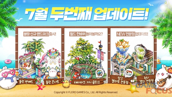 이번 업데이트를 통해 찹쌀떡을 연상케하는 귀여운 토끼 캐릭터 '몰랑'과의 컬래버레이션 아이템 2종이 새롭게 등장했다. 이번에 추가된 건물은 랜드마크 '몰랑 콘서트'와 조경물 '몰랑 썬베드'로, '몰랑 랜드마크II 패키지'를 이용하면 저렴하게 구입할 수 있다.
