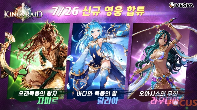 갓 해츨링을 벗어난 블루 드래곤 소녀 '릴리아'는 '킹스레이드'의 인기 영웅 '라이아스'의 여동생으로, 휘몰아치는 거대한 물의 힘을 사용하는 마법사이다. '자피르'는 고대 신왕의 피가 흐르는 사막의 왕자로 모래를 자유자재로 부릴 수 있는 권능을 가진 궁수이다. 사막의 유랑민족 출신인 '라우디아'는 아름다운 춤으로 상대의 마음을 녹이지만 조용한 스침으로도 적의 목숨을 빼앗는 암살자이다.