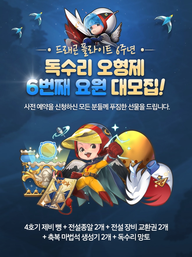 라인게임즈는 '6주년 기념 페이지'를 통해 9월17일까지 콘텐츠 컬래버레이션 사전 예약을 진행하며, 사전 예약 참가 유저에게는 '독수리 오형제' 막내 캐릭터인 '제비 뼝' 새끼용 및 '독수리 망토', '전설종 알 2개' 등을 선물한다.