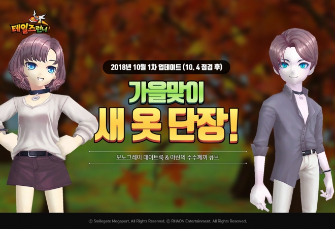 스마일게이트 메가포트(대표 장인아)가 서비스하는 인기 온라인 레이싱 게임 '테일즈런너'(개발사 라온엔터테인먼트)에 가을맞이 업데이트로 신규 코스튬과 아린의 수수께끼 큐브 등을 업데이트했다.