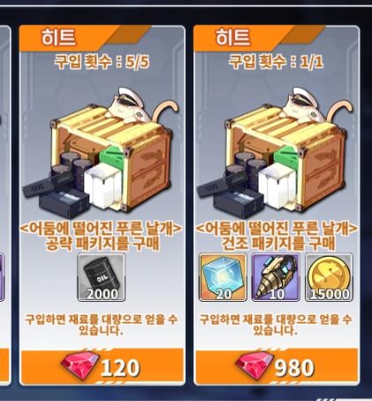 상기 스크린샷과 같이 저렴한 가격에 필요한 물품을 구매할 수 있는 한정 공략 패키지 및 한정건조 패키지가 추가된다. 해당 패키지는 11월 13일 23:59:59까지 판매가 진행된다.
