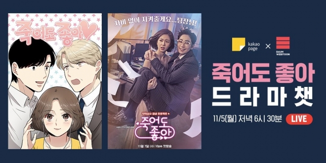 다음웹툰과 카카오페이지는 ‘죽어도 좋아’의 첫방송을 앞두고5일(오늘) 저녁6시30분 드라마챗 라이브 프로모션을 진행한다.