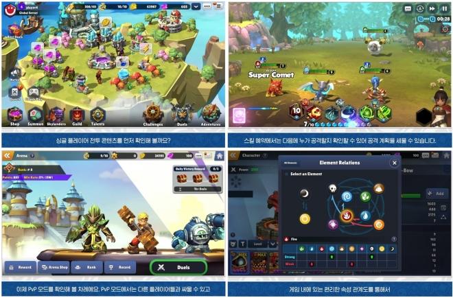또한, 스토리 모드 및 보스 전투, PVP 등 다양한 콘텐츠에 등장하는 스카이랜더들의 개성 넘치는 외형과 함께 속성별 상생 혹은 상극 관계를 활용한 흥미진진한 전투 장면을 미리 확인할 수 있다.