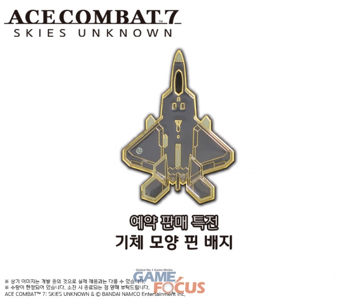 또한 12월 19일부터 시작되는 PlayStation®4 '에이스컴뱃 7: 스카이즈 언노운'(한국어판)의 예약 판매 실물 특전으로 기체 모양의 핀 배지를 증정한다.