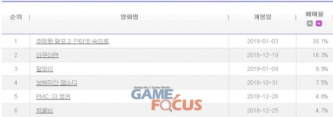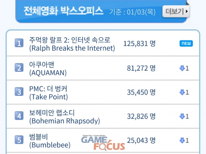 영진위 통합전산망에 따르면 '주먹왕 랄프 2: 인터넷 속으로'는 개봉 첫날인 1월 3일(목) 125,831명의 관객을 동원하며 '아쿠아맨', 'PMC: 더 벙커', '보헤미안 랩소디', '범블비' 등 쟁쟁한 경쟁작들을 제치고 박스오피스 1위를 차지했다. 또한 박스오피스 TOP10 영화 중 좌석판매율 1위(24.7%)를 차지한 것은 물론, CGV, 롯데시네마, 메가박스 등 각 극장 사이트에서 압도적인 수치로 예매율 1위를 지키고 있어 개봉주 흥행 성적에 귀추가 주목된다.
