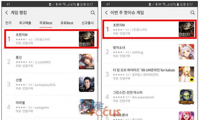 초한지M은 원스토어에서 핫이슈게임과 무료베스트 순위에서 1위에 올랐을 뿐 아니라, '이번주 강력추천게임', '내가 라이징스타', '무림고수를 위한 추천게임' 등의 카테고리에서 피처드에 올랐고, 목록에서도 가장 상위에 노출되는 경우가 많았다.