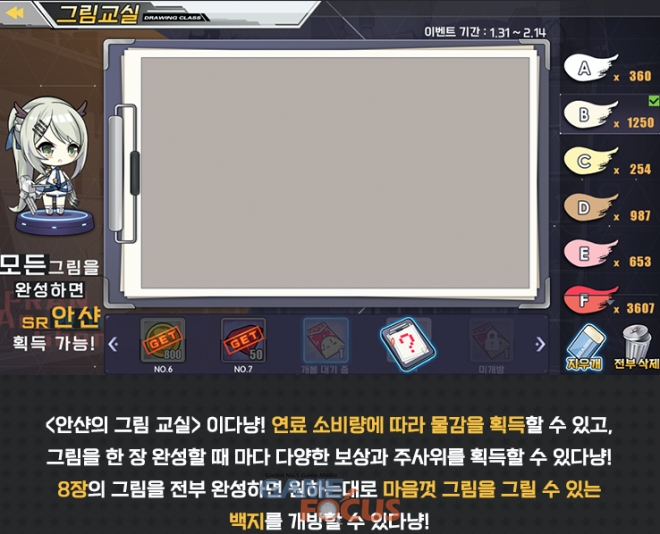 연료 소비 미션으로 물감을 획득, 8장의 그림에 색깔을 전부 채우면 이벤트 캐릭터 '안샨' 을 획득할 수 있다.
