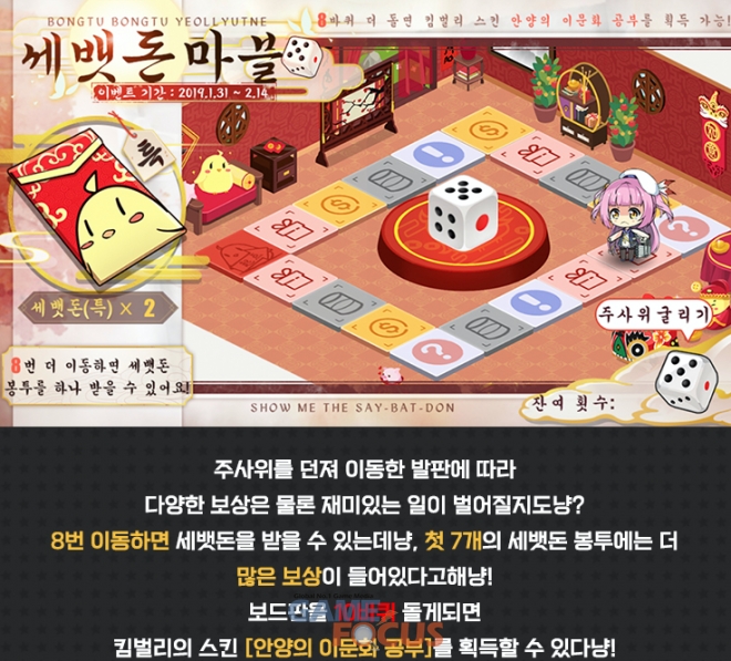 각종 이벤트를 통해 획득한 주사위를 던져, 이동한 발판에 따라 다양한 보상과 세뱃돈을 획득할 수 있고, 보드판을 10바퀴 완주하면 킴벌리의 스킨 [안양의 이문화 공부] 를 획득할 수 있다.