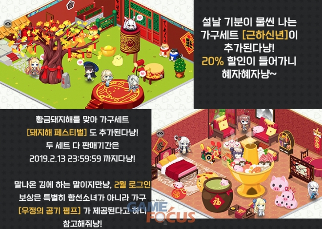 타 서버에서 일찍이 추가되었었던 '근하신년' 가구 세트가 20% 할인된 가격으로 판매되고, 타서버와 함께 '돼지해 페스티벌' 가구 세트가 함께 추가된다.