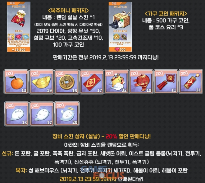 랜덤 스킨을 뽑을 수 있던 인기 패키지 '복주머니'와 '가구 코인' 패키지가 2월 13일까지 판매되며, 장비 스킨 상자를 통해 랜덤으로 설날 테마 장비 스킨을 획득할 수 있다.
