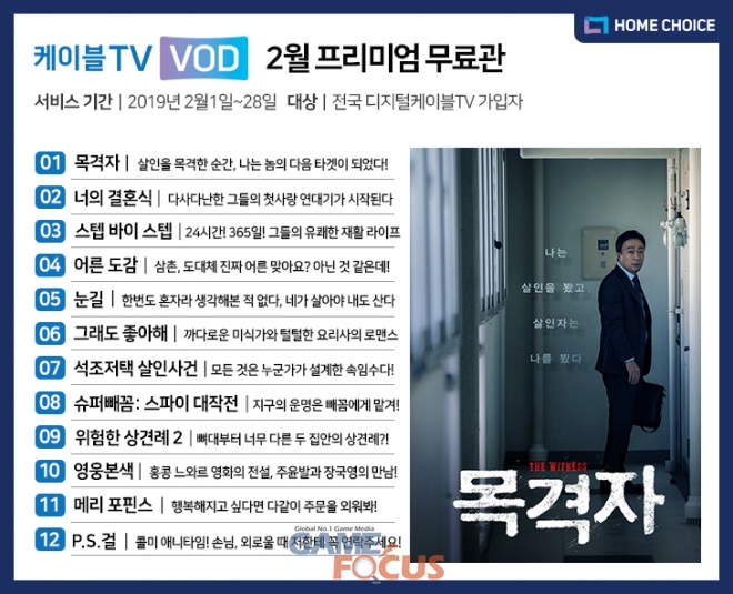 디지털케이블TV가 '목격자' 등 12편의 VOD를 '2월 프리미엄 무료관'을 통해 무료로 제공한다.