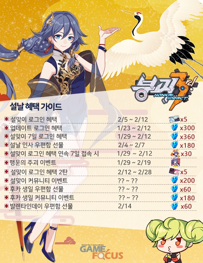 또한, 오는 2월 4일부터 7일까지 게임에 접속할 시에는 우편함에서 180 수정 선물을 받을 수 있으며, 오는 2월 19일까지는 메인 스토리와 연대기 스테이지, 코스튬 체험 스테이지에 필요한 체력 소모량이 반으로 감소되는 혜택도 누릴 수 있다. 이와 함께 프로모션 기간 동안 이벤트 임무가 새롭게 개방되어 이를 통해 성흔 '후카·새해 (상)'과 1/3 결정 등의 푸짐한 아이템을 받아볼 수 있는 다채로운 즐길 거리를 만나볼 수 있다.