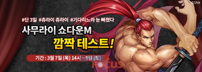 조이시티(각자대표 조성원, 박영호)가 모바일 액션 MMORPG '사무라이 쇼다운 M'의 3월 13일 정식 출시를 앞두고 깜짝 테스트를 실시한다.