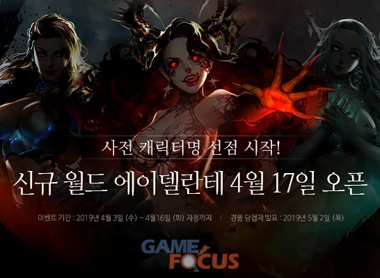 (주)소프톤엔터테인먼트(대표 홍명진)는 자사 호러 액션 MMORPG '다크에덴'에서 만물이 생겨나는 봄과 어울리는 신규 월드 '에이델란테'를 4월 17일에 오픈 예정이며, 캐릭터명 선점 이벤트를 전격적으로 시작한다고 밝혔다.