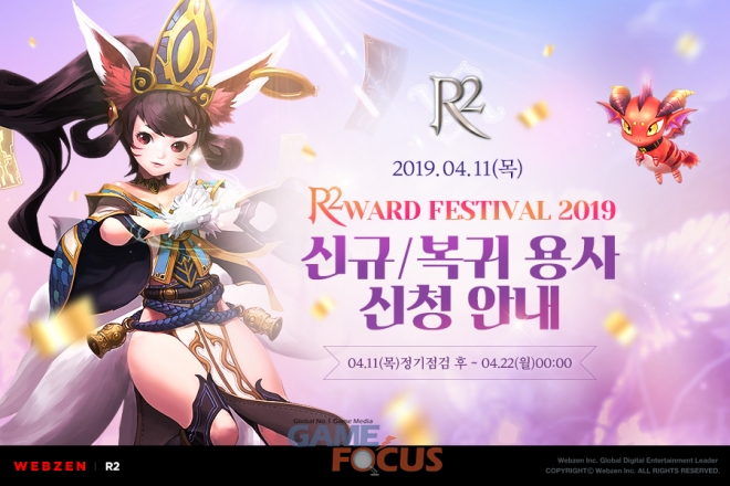 웹젠은 금일(4월 11일) 'R2'의 'R2WARD FESTIVAL 2019' 이벤트 티징 페이지를 열고 4월 22일까지 회원들을 대상으로 신규/복귀 신청 이벤트를 진행한다.