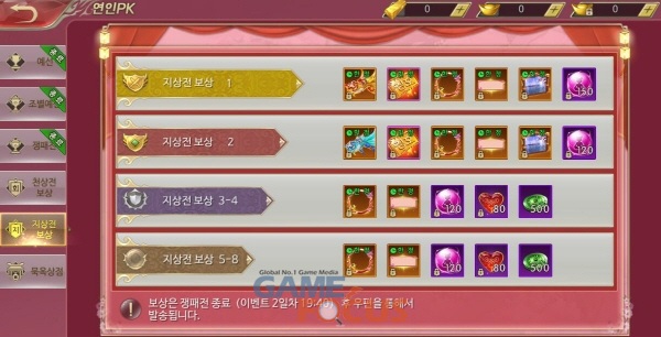 연인PK 이벤트는 213 레벨이상의 2명 이성유저가 파티를 맺어 참여해야 하며, 연인 PK 시작후 파티장이 예선전을 신청하여 바로 참여를 할 수 있다. 20회의 예선전을 치르고 포인트가 가장 많은 160팀이 조별 예선전에 오르며, 조별예선전 중 각 조의 1,2 등은 천상전으로, 3,4 등은 지상전을 치르게 된다. 천상전과 지상전이 서로 경합을 벌여 가장 마지막에 남은 유저가 최종적으로 우승을 하게 된다.