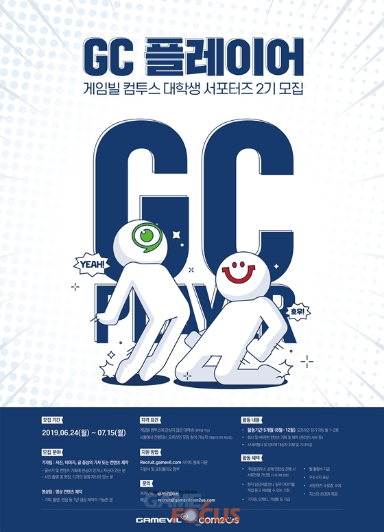 앞서 선발된 GC 플레이어 1기들은 '게임빌컴투스뉴스' 기자 참여, '캠퍼스 리크루팅' 영상 제작 등 다양한 활동을 하며 주목받은 바 있다.