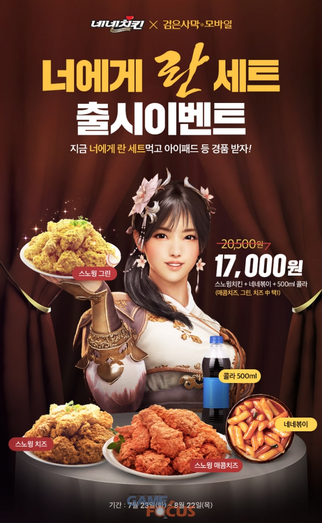 펄어비스(대표 정경인)가 자사가 서비스 중인 모바일 MMORPG '검은사막 모바일'에서 신규 클래스 '란' 출시 기념으로 네네치킨과 제휴를 맺고 '너에게 란' 세트를 출시했다.