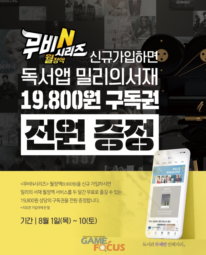 한 달 이용료가 9,900원인 '무비N시리즈'에 가입하면 19,800원 상당의 '밀리의 서재' 2개월 구독권을 받을 수 있는 파격적인 이벤트다. '밀리의 서재' 신규 이용자의 경우 '밀리의 서재'에서 제공하는 1 개월 무료 서비스를 포함, 총 3개월의 무료 혜택을 누릴 수 있다.