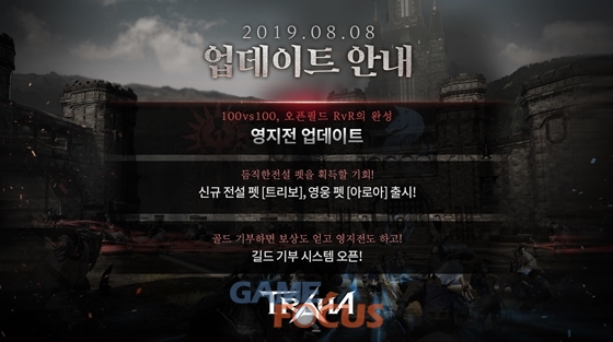 길드 영지전 입찰에 도움을 주는 길드 기부 시스템도 도입했다. 또 특정 캐릭터 능력치를 높여주는 전설 등급의 신규 펫 '듬직한 길잡이 트리보'와 레벨에 따라 최대 생명력과 치명타 회피력이 증가하는 영웅 등급의 펫 '환희의 요정 아로아'를 추가했다.