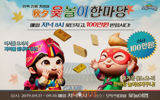 오는 9월 18일까지 매일 오후 저녁 8시까지 '윳놏이맵'에서 가장 많은 연승을 기록한 이용자에게 현금 100만원을 지급하는 '윳놀이맵 이벤트'를 진행한다. '윳놀이맵'은 플레이만 해도 게임 내 고급캐릭터인 '한복루시아' 캐릭터도 획득 할 수 있다.