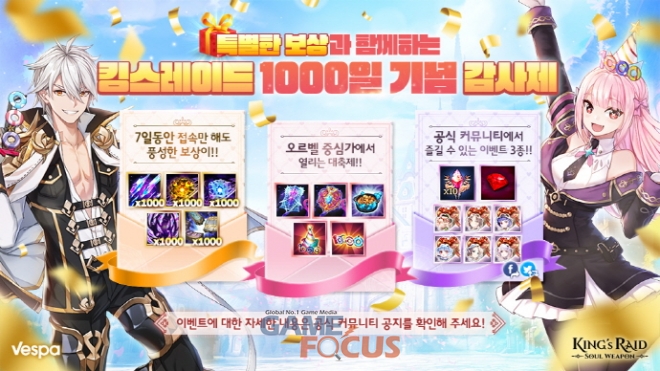 베스파(대표 김진수)가 개발 및 서비스하는 '킹스레이드'가 정기 업데이트와 함께 다가오는 서비스 1000일에 앞서 다채로운 이벤트 업데이트를 진행했다.