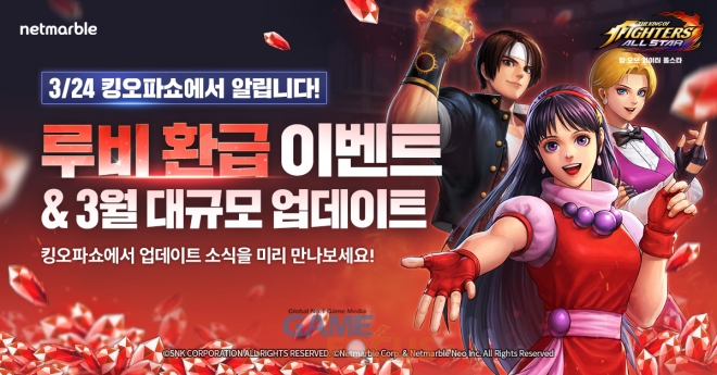 넷마블(대표 권영식, 이승원)은 액션 RPG '더 킹 오브 파이터즈 올스타(이하 킹 오브 파이터 올스타)'에 게임 내 재화인 루비 환급 이벤트를 실시한다.