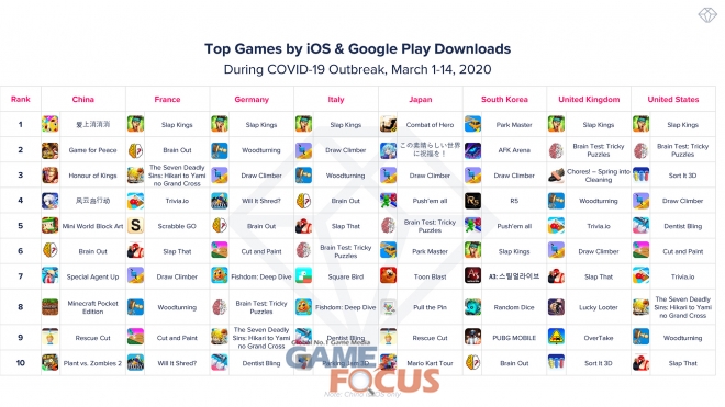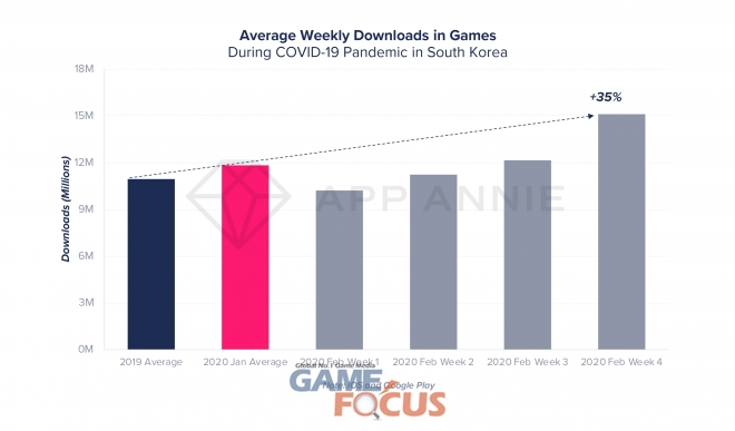 코로나19 사태 초기 발생국 중 하나인 한국 역시 게임 다운로드가 급증했다. 2월 마지막 주(2월 23일 시작 주) 주간 게임 다운로드 숫자는 전년 평균 대비 35%가 증가해 1,500만 건 이상의 게임이 다운로드됐다. 전월인 1월과 비교하면 25%가 증가했다.