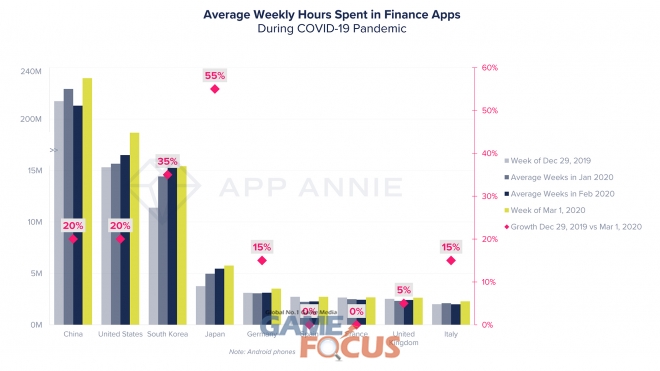 금융 앱들의 사용시간 역시 증가했다. 3월 1째주 금융앱 사용시간은 일본(55%), 한국(35%), 미국(20%) 및 중국(20%) 순으로 증가세가 높았다.