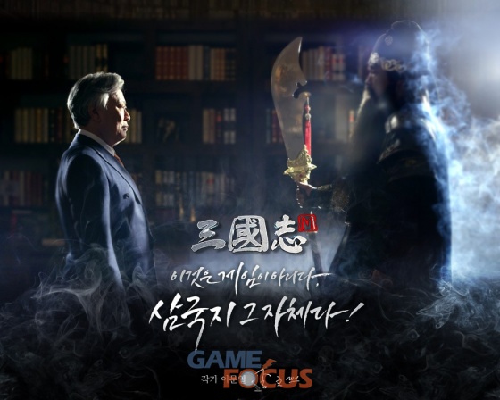 이번에 공개된 티저 이미지에서는 삼국지M의 홍보모델인 '이문열' 소설가와 관우가 서로를 마주 보고 있다.