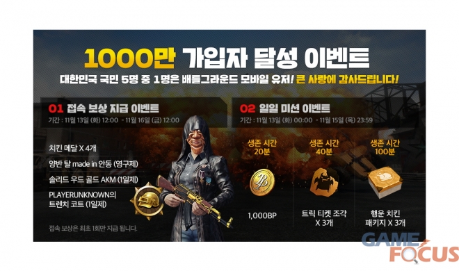 펍지주식회사(대표 김창한)가 자사가 서비스 중인 '배틀그라운드 모바일'에서 1000만 가입자 돌파를 기념해 한정 기간 동안 접속 보상 이벤트와 일일 미션 이벤트를 진행한다. 배틀그라운드 모바일은 지난 5월 출시 이후 꾸준한 인기를 모으며 6개월 만에 가입자 1000만을 넘겼다.