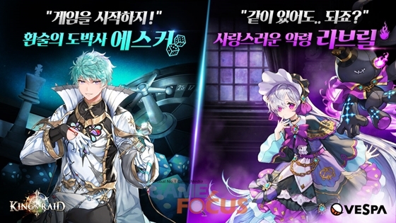 '킹스레이드'에서 새롭게 선보이는 영웅 캐릭터는 환술 도박사 '에스커'(마법사)와 사랑스러운 악령 '라브릴'(사제) 등 2종이다.