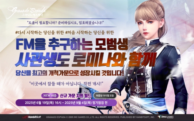한빛소프트가 자사에서 퍼블리싱하고 IMC게임즈에서 개발한 PC 온라인 MMORPG '그라나도 에스파다'의 새로운 보상들로 단장한 '신규가문지원월드(퍼플)'를 선보...