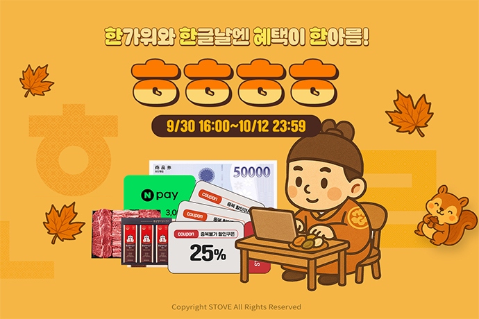스마일게이트의 게임 플랫폼 ‘스토브’가 한가위와 한글날을 맞아 대규모 가을 할인 이벤트 ‘ㅎㅎㅎㅎ 2025’ 프로모션을 진행한다고 30일(화) 밝혔다. ‘ㅎㅎ...