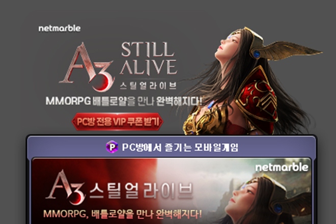 넷마블(대표 권영식, 이승원)이 오늘 오전 11시에 모바일 최초 배틀로얄 MMORPG(다중접속역할수행게임) ‘A3: 스틸얼라이브'를 국내 구글 플레이와 애플 앱스토어에 정...
