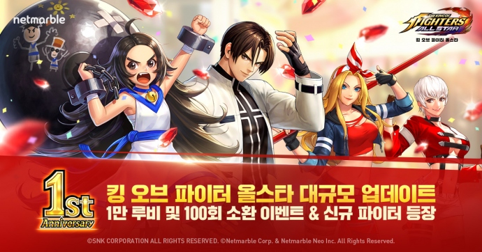 넷마블(대표 권영식)이 액션 RPG '더 킹 오브 파이터즈 올스타(이하 킹 오브 파이터 올스타)'에 신규 캐릭터 추가 및 '1만 루비 릴레이 슈퍼미션' 등을 포함한 대규모 업...