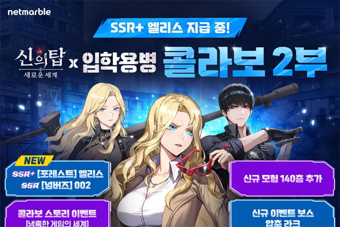 넷마블(대표 권영식, 김병규)은 수집형 애니메이션 RPG <신의 탑: 새로운 세계>(개발사 넷마블엔투)와 네이버웹툰 '입학용병'의 콜라보레이션 이벤트 2부를 시작했...
