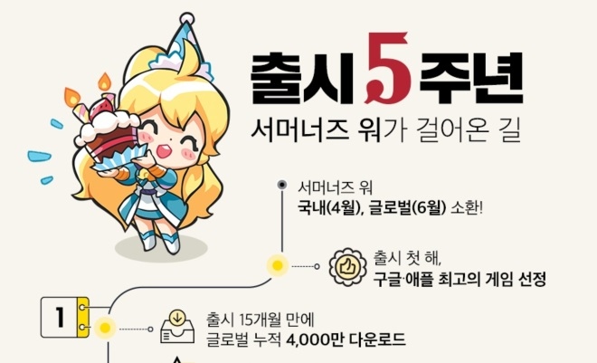 컴투스(대표 송병준)가 자사의 글로벌 RPG '서머너즈 워: 천공의 아레나'(이하 서머너즈 워) 출시 5주년을 맞아, 세계 유저와 함께 성장한 지난 5년의 성과를 담은 인포...
