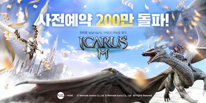 위메이드이카루스(대표 장현국)가 개발하고 위메이드서비스(대표 송모헌)에서 퍼블리싱하는 모바일 MMORPG '이카루스M'이 오늘(25일) 사전예약 신청자 수 200만 ...